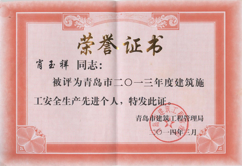肖玉祥-青島市建筑施工安全生產(chǎn)先進(jìn)個(gè)人